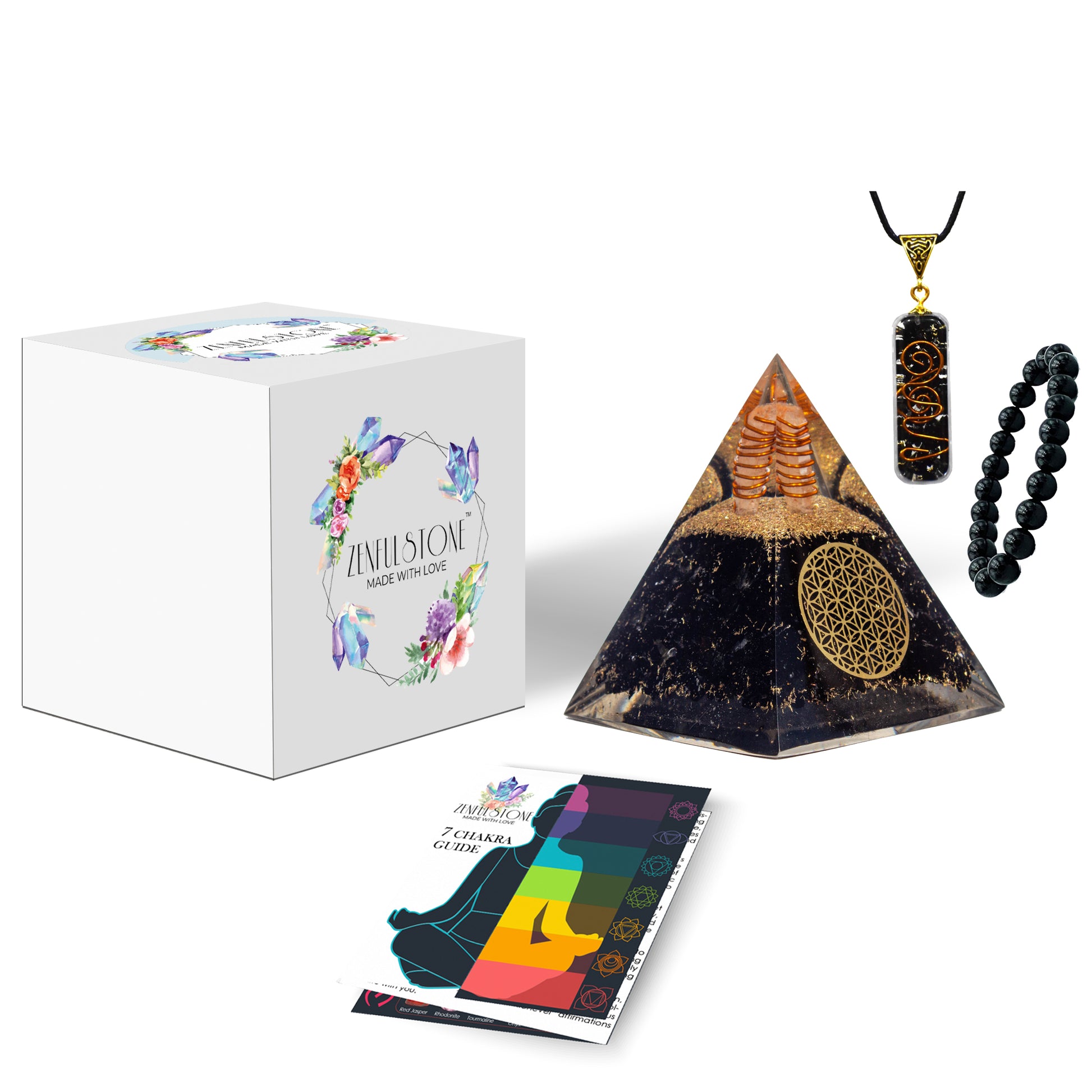 Orgone Energy Generator Set of Pyramid, Pendant, And Bracelet is crafted entirely by hand in India, using Orgonite Crystals, Orgonite Metals, and various natural crystals sourced from around the world. When Natural Chakra crystals react with Orgone Energy, powerful vibrational energy is created, bringing positivity to everybody.