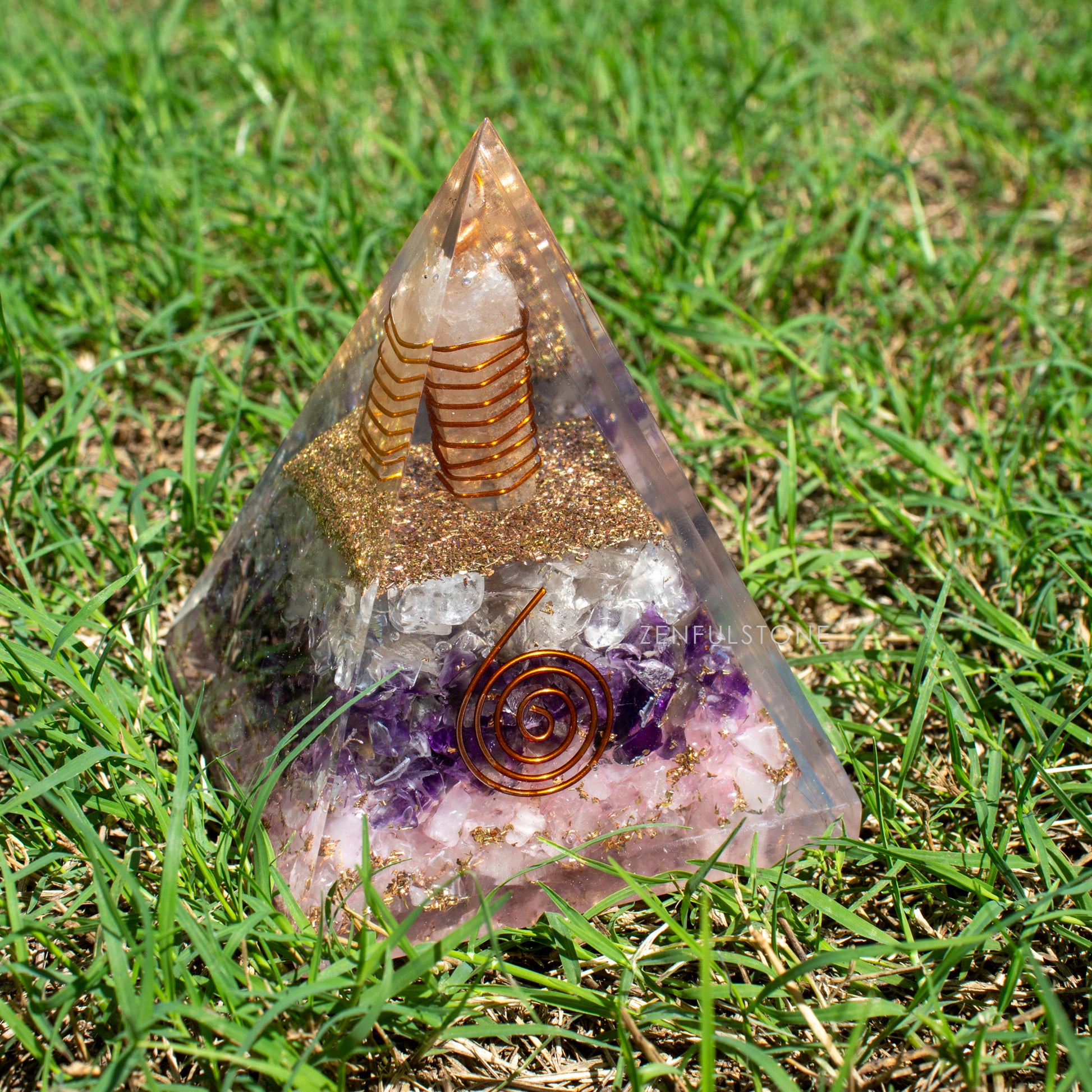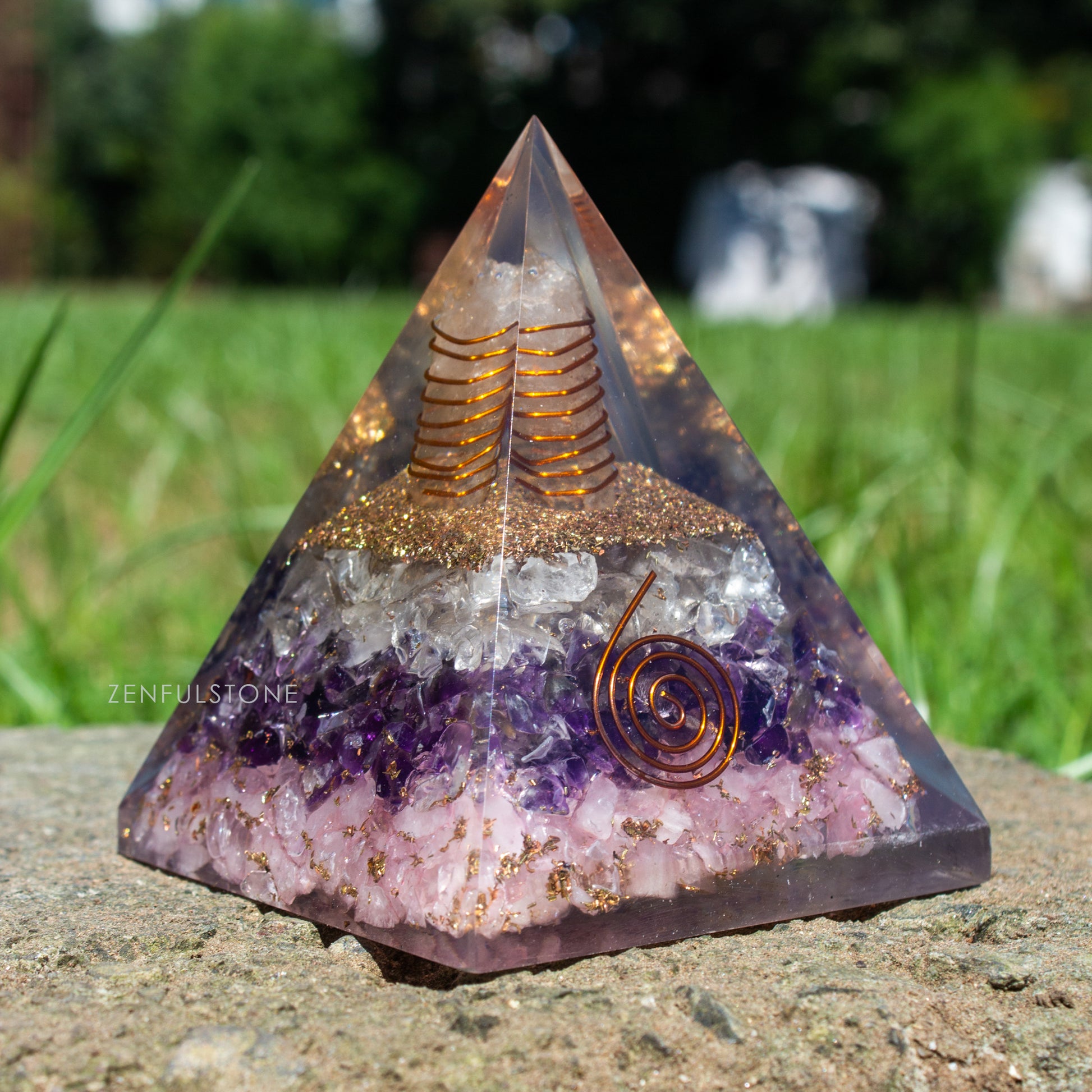 Amethyst, Clear Quartz & Rose Quartz Triple Layered Orgone Pyramid